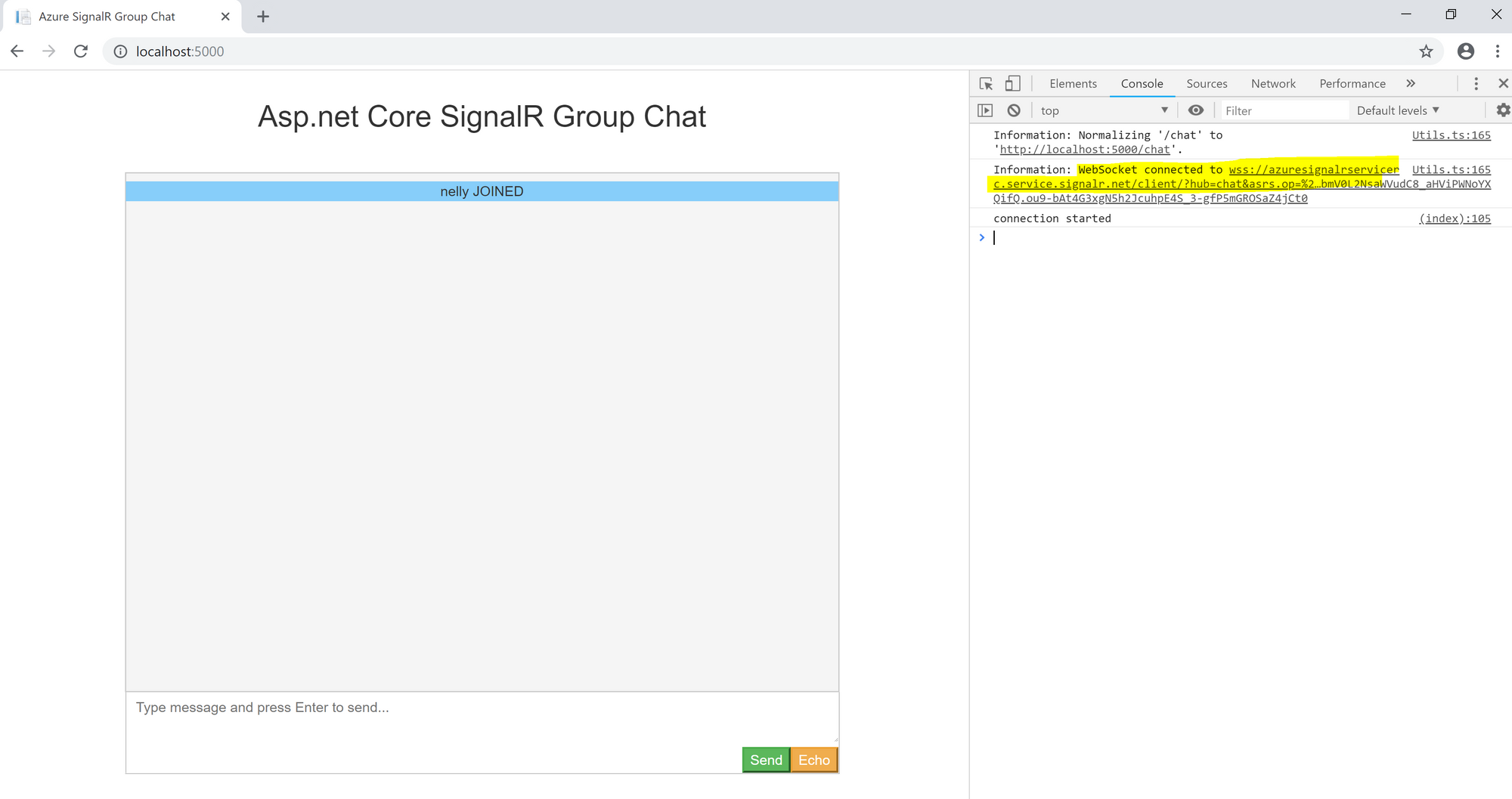 once I run the .netCore app and my client app Locally they are all good and as console shows it is connected to the SignalR service which I already created:
