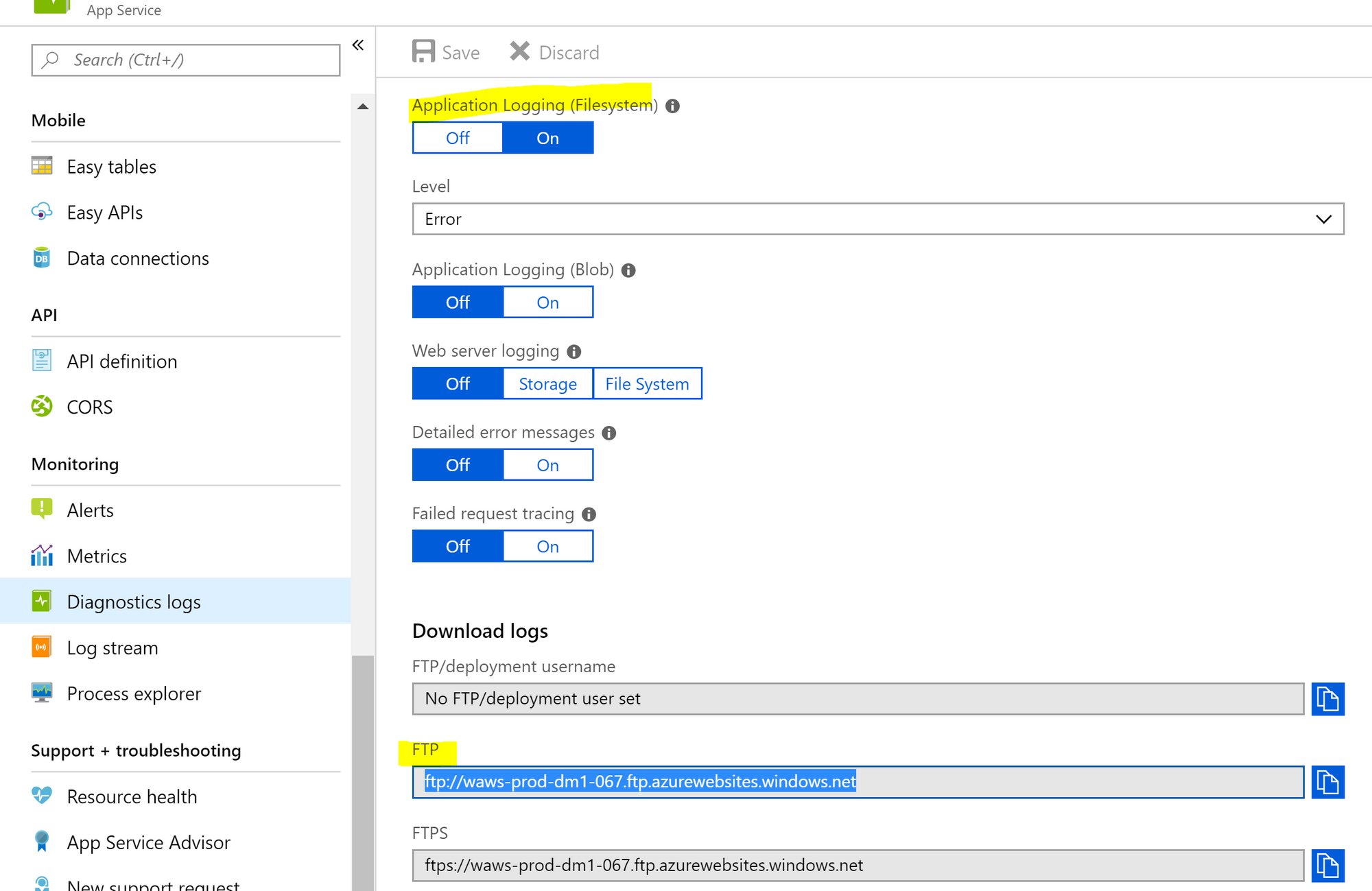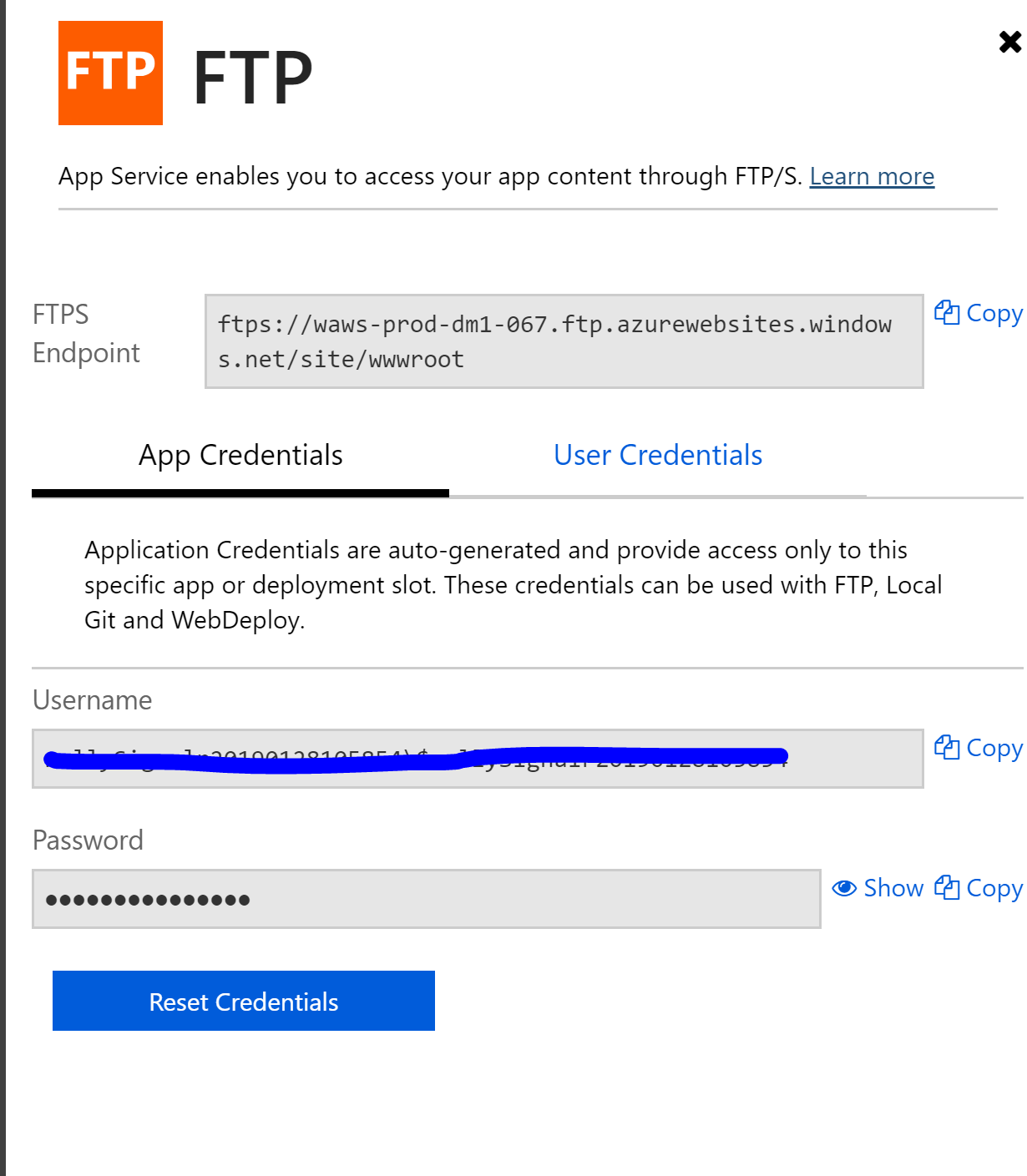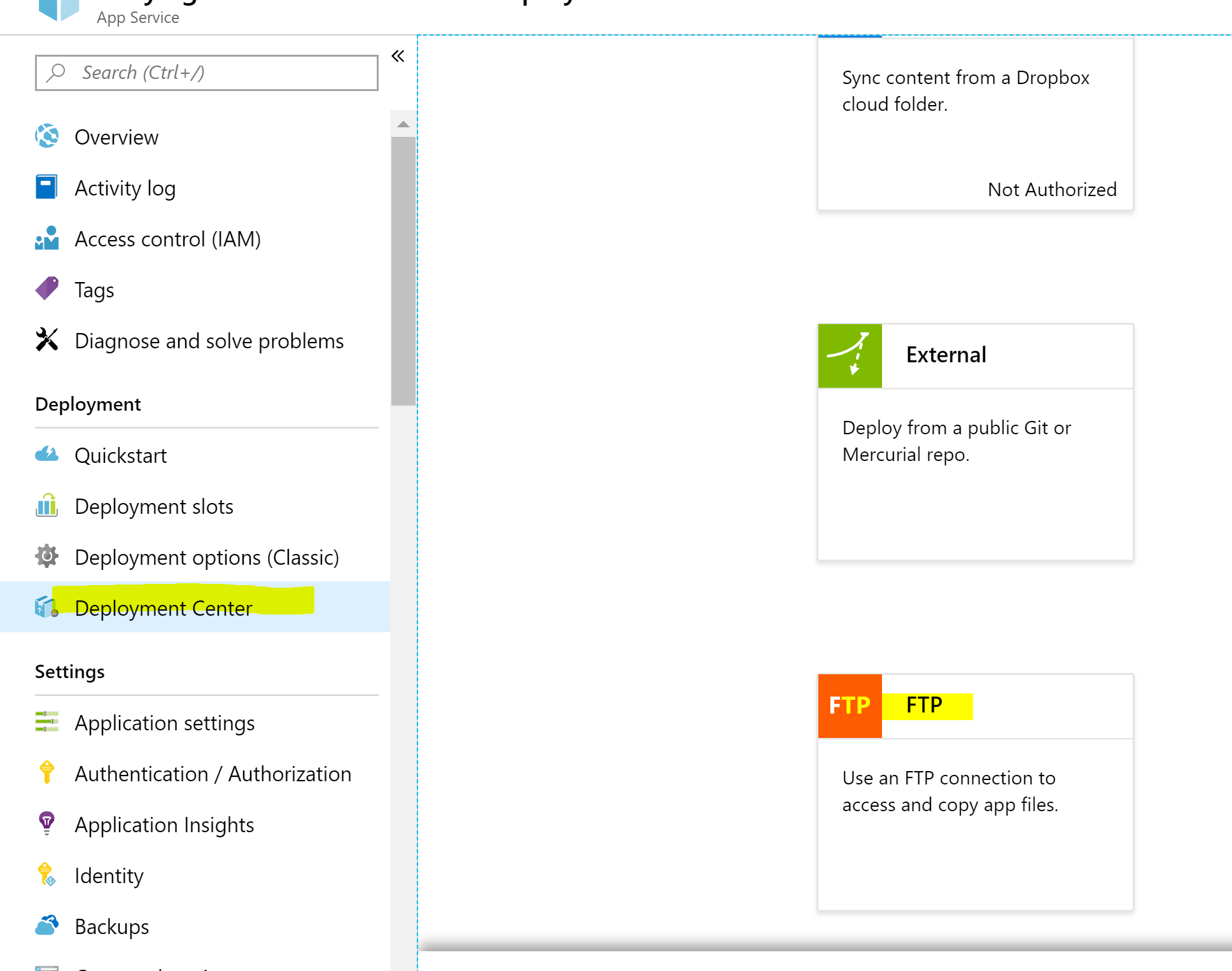 Now you are able to connect to the FTP by using the FTP Url. Once you open the Url, you are required to enter your credentials. Where to get it? Once you click the relevant app service, you will see the menu "Development Center"