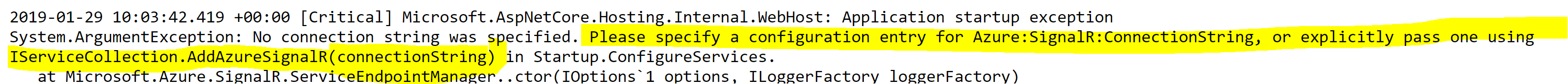 services.AddSignalR().AddAzureSignalR("Endpoint=https://azuresignalrservicerc.service" +".signalr.net;AccessKey=999n1gcxWMYq52sw=");
